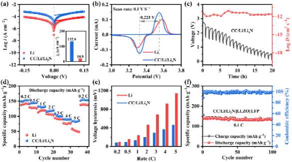 为了进一步评估CC/Li/Li 3 N电极在实际应用中的可行性,通过全电池测试探索了其电化学性能。CC/Li/Li 3 N||LFP全电池在液态电解质中显示出良好的倍率性能和循环稳定性,并且在固态电池中经过100次循环后显示出96.7%的高容量保持率 。