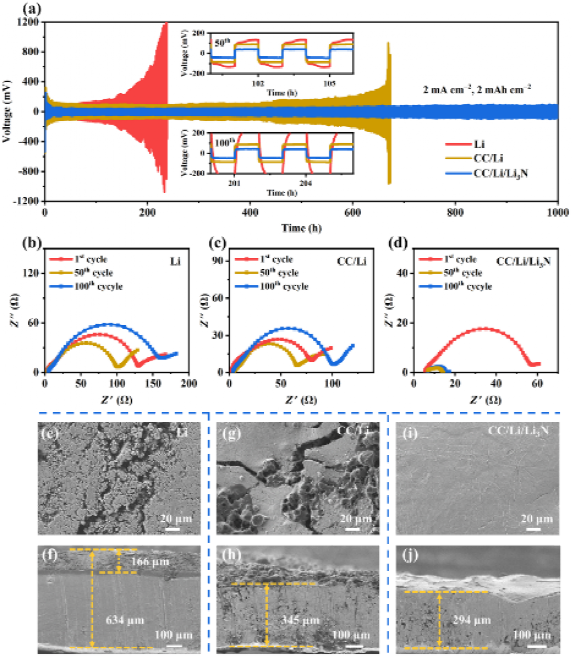 图3. CC/Li/Li 3 N为工作电极组装的对称电池循环性能和循环后的电极形貌