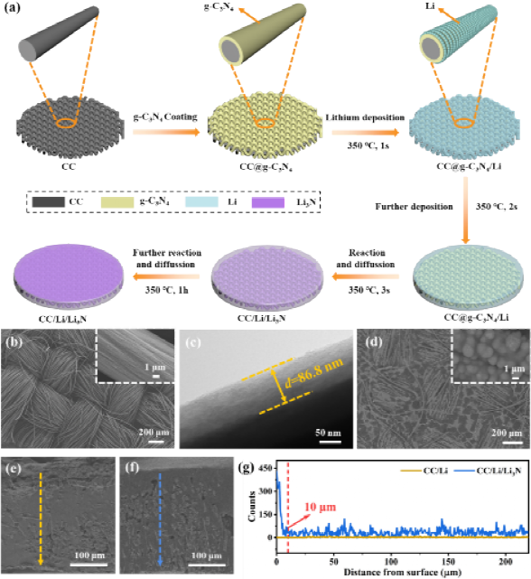 图1. CC@g-C 3 N 4 及CC/Li/Li 3 N的制备过程示意图和微观结构表征