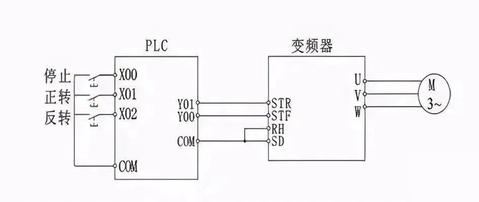 PLC的开关量信号控制变频器PLC(MR型或MT型)的输出点、COM点直接与变频器的STF(正转启动)、RH(高速)、RM(中速)、RL(低速)、输入端SG等端口分别相连。PLC可以通过程序控制变频器的启动、停止、复位;也可以控制变频器高速、中速、低速端子的不同组合实现多段速度运行。但是,因为它是采用开关量来实施控制的,其调速曲线不是一条连续平滑的曲线,也无法实现精细的速度调节。