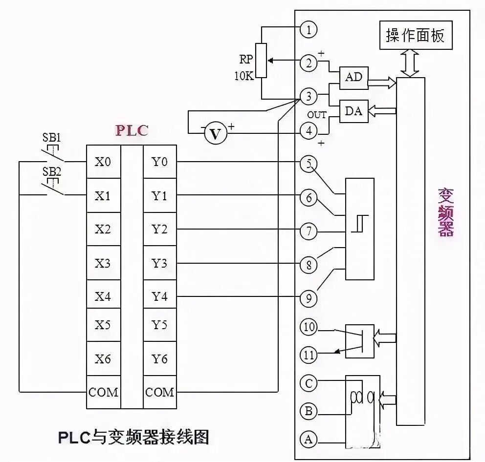 利用PLC的模拟量输出模块控制变频器PLC的模拟量输出模块输出0~5V电压信号或4~20mA电流信号,作为变频器的模拟量输入信号,控制变频器的输出频率。 这种控制方式接线简单,但需要选择与变频器输入阻抗匹配的PLC输出模块,且PLC的模拟量输出模块价格较为昂贵,此外还需采取分压措施使变频器适应PLC的电压信号范围,在连接时注意将布线分开,保证主电路一侧的噪声不传至控制电路。