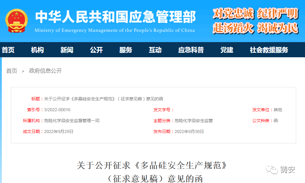 为落实全国危险化学品安全风险集中治理方案部署,强化多晶硅安全风险管控,应急管理部危化监管一司组织制定了《多晶硅安全生产规范》(征求意见稿)和编制说明(分别见附件1、2),根据《应急管理标准化工作管理办法》规定,现向社会公开征求意见。此次公开征求意见时间为即日起至2022年11月29日,反馈意见请填写征求意见表(见附件3)后发送至指定电子邮箱()。