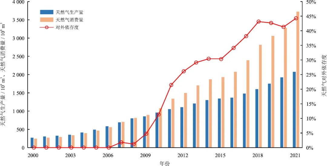 近 20 年来,中国天然气产量和消费量均快速增长,但消费量近 10 年的增速显著高于产量的增速,供需缺口不断拉大(图 2 )。 2021 年,全国天然气生产量为 2 076 × 10 8 m 3 ,相比 2020 年增加约 151 × 10 8 m 3 ,连续 6 年产量增长超过 100 × 10 8 m 3 。但与此同时, 2021 年全国天然气表观消费量达 3 726 × 10 8 m 3 ,天然气对外依存度攀升至 44.3% [10] 。