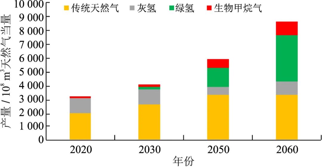 经估算, 2030 年我国传统天然气产量将超过 2 500 × 10 8 m 3 (图 4 ),氢气产量按照热值约相当于 1 250 × 10 8 m 3 天然气,其中绿氢占比约 13.5% ;生物 甲烷气产量约 200 × 10 8 m 3 。氨气作为能源,利用量和场景还比较小,在不考虑氨气情景下,气体能源产量合计超过 4 000 × 10 8 m 3 天然气当量。 2050 年, 我国传统天然气产量将达到 3 200 × 10 8 m 3 、氢气产量约 2 016 × 10 8 m 3 天然气当量(绿氢占比 70% )、生物甲烷气产量超过 600 × 10 8 m 3 ,气体能源产量合计接近 6 000 × 10 8 m 3 天然气当量。 2060 年,传统天然气产量保持在约 3 200 × 10 8 m 3 ,氢气产量达到接近 4 400 × 10 8 m 3 天然气当量(绿氢占比 77% ),生物甲烷气产量达到 1 000 × 10 8 m 3 ,气体能源产量合计超过 8 000 × 10 8 m 3 天然气当量,基本满足我国工业和气体能源工业需求量。