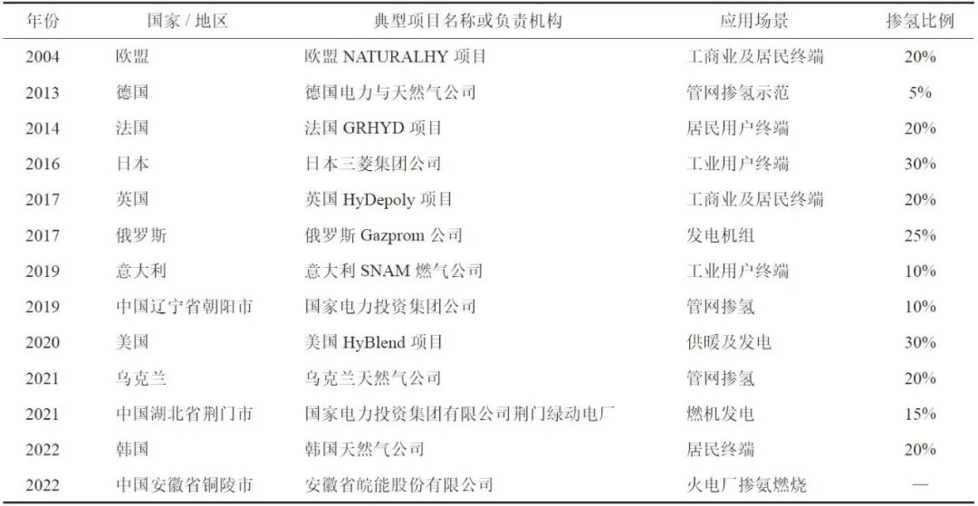 与天然气相比,氢气具有火焰传播速度快、点火能量低和稀释能力强等优点,天然气中掺混一定比例的氢气,可降低碳排放量。国内外试验和实际 使用结果表明,天然气掺混 3%~5% 的氢气,对锅炉和煤气灶等终端使用设备没有任何的影响,部分国家正在进行的掺混 20% 氢气实验项目尚未发现安全问题(表 4 )。