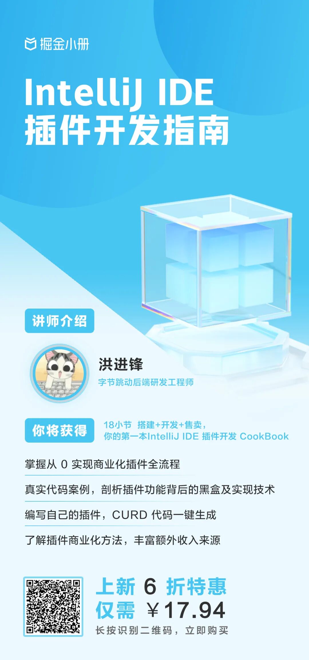 使用过 IntelliJ IDEA 开发过 Java 项目,当然,这点也不是必要条件,在本课程中,会全程带领大家从 0 到 1 开发一个插件项目,这其中也包括对所使用到的 IDE 的一些操作指引。 一颗好奇的心,一个有想法的脑袋。