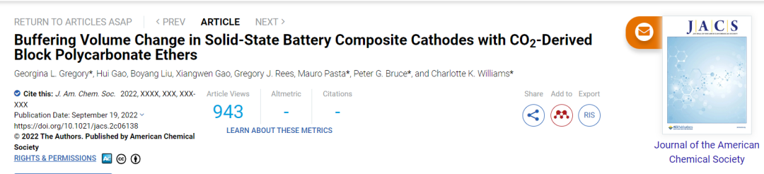 Georgina L. Gregory, et al, Buffering Volume Change in Solid-State Battery Composite Cathodes with CO 2 ‑ Derived Block Polycarbonate Ethers, J. Am. Chem. Soc., 2022