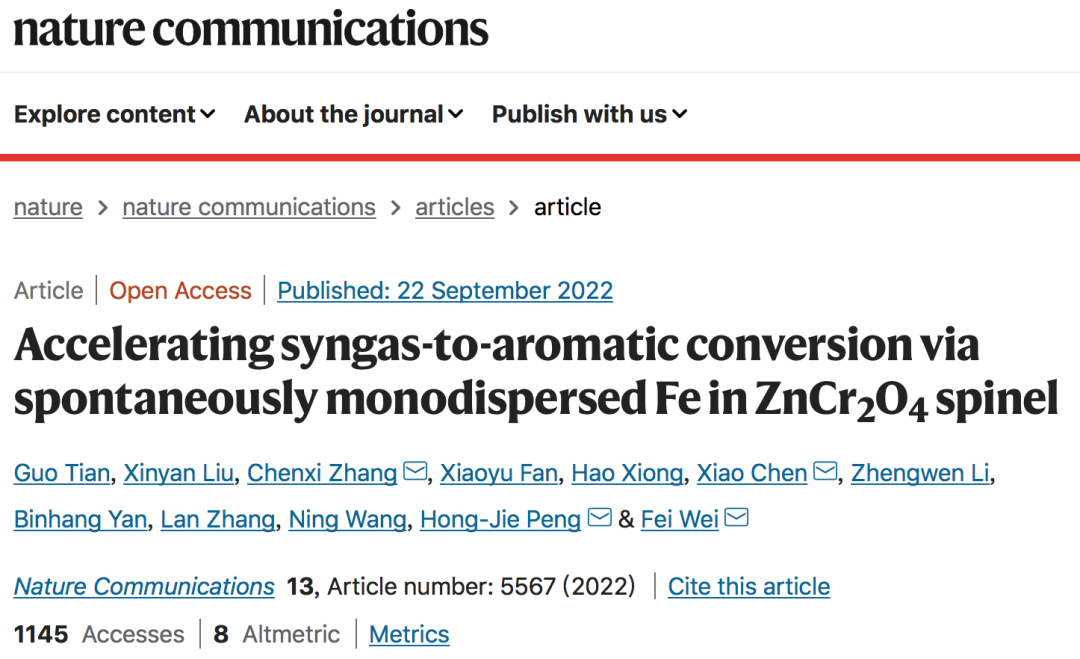 Tian, G., Liu, X., Zhang, C. et al. Accelerating syngas-to-aromatic conversion via spontaneously monodispersed Fe in ZnCr 2 O 4 spinel. Nat Commun 13, 5567 (2022).