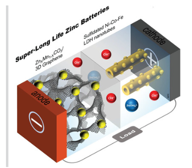 近日, 塔比阿特莫达勒斯大学Mir F. Mousavi,加州大学洛杉矶分校Richard B. Kaner 首次展示了一种高性能和超长寿命的水系锌基储能装置,该装置由混合的碳酸锌和碳酸锰(ZnCO 3 MnCO 3 )接枝到石墨烯气凝胶(GA)纳米复合材料(ZMG)上作为负极(阳极)和硫化的Ni-Co-Fe层状双氢氧化物(LDHs)作为正极(阴极)组成,在ZnO饱和的6.0 M KOH电解液中。