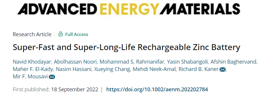 Navid Khodayar, et al, Super-Fast and Super-Long-Life Rechargeable Zinc Battery, Adv. Energy Mater. 2022