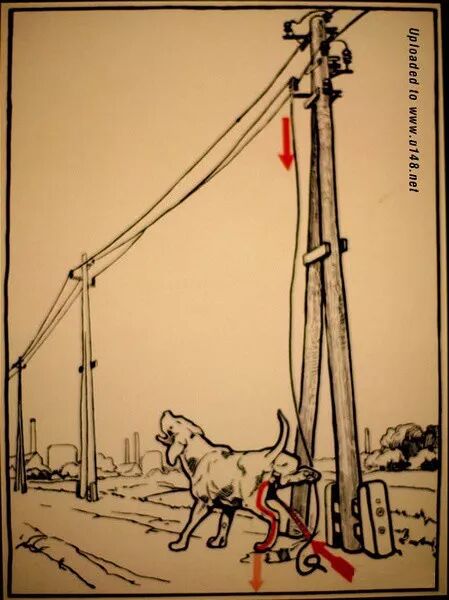 21.在电线杆下小便 ,这只狗遭殃 ,关键是电线掉了下来 ,碰到了小便 ,人可能不会有这种情况,不要随便用手去碰裸露在外面的电线 。