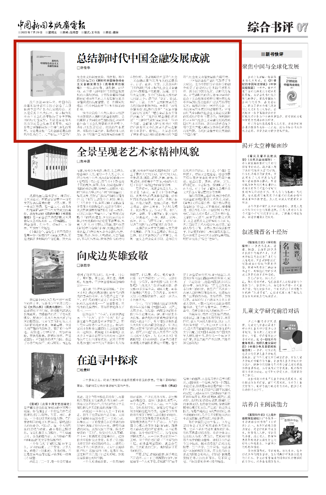 日前,湖北经济学院党委常委,金融学院院长、二级教授、博导,湖北名师工作室主持人许传华,为本书撰写的书评“总结新时代中国金融发展成就”发表于《中国新闻出版广电报》。