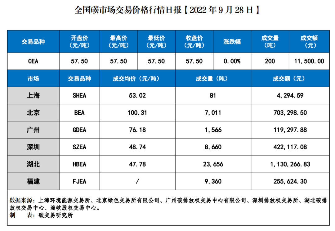 【碳市行情】2022年9月28日碳市场交易数据