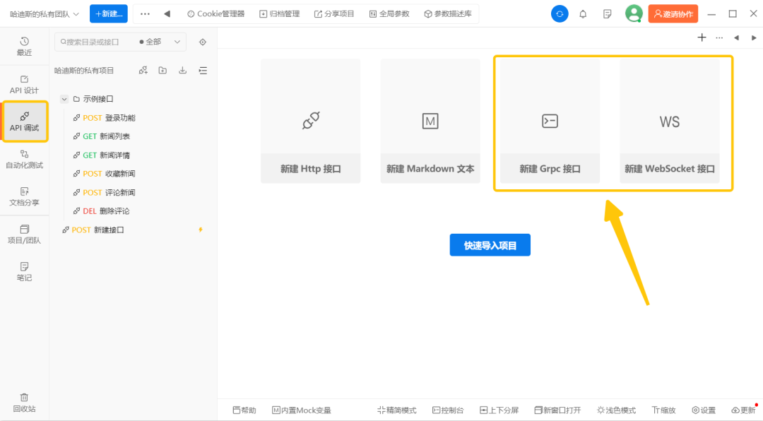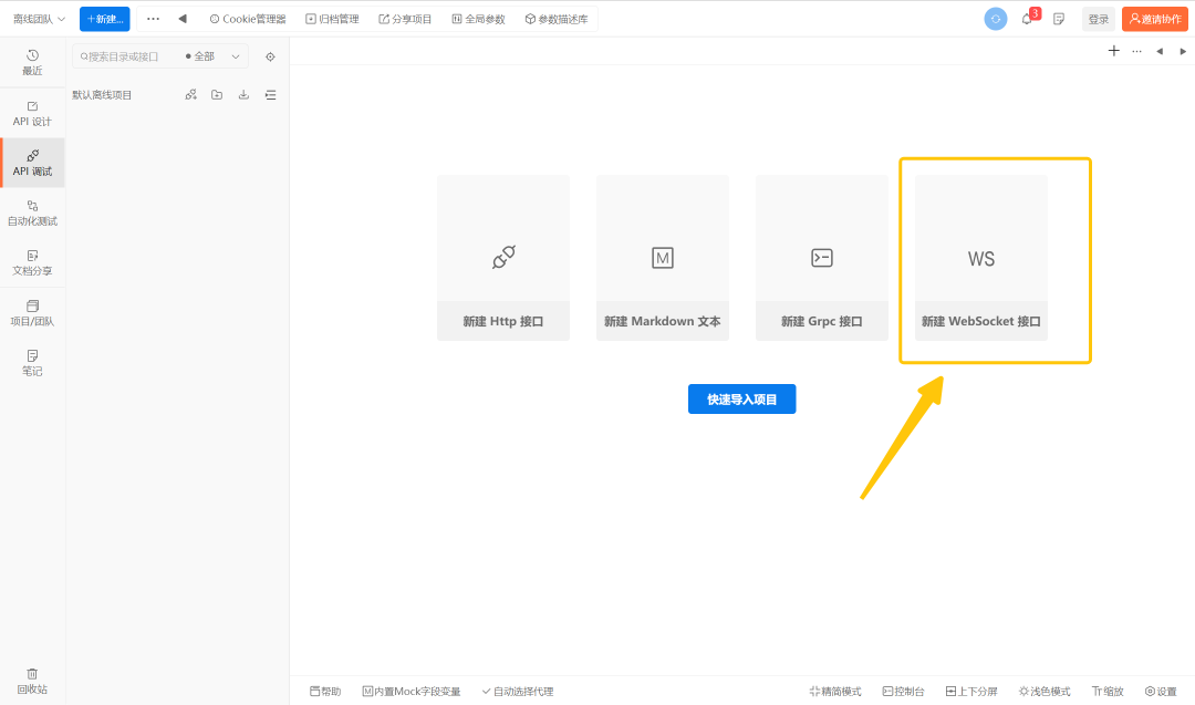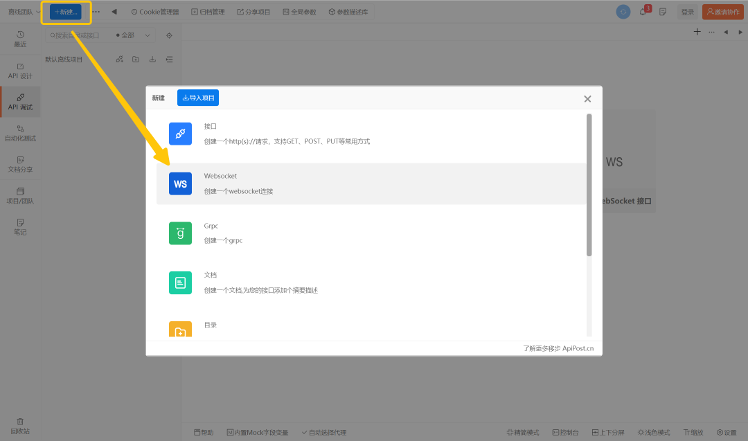 打开工作台后,可以看到明显的新建WebSocket入口,或者点击团队旁边的“新建”按钮也可以新建。