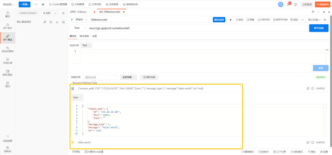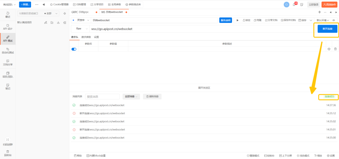 经过多位用户的反馈建议,Apipost终于在最新更新的7版本中 率先开始支持gRPC和WebSocket类型的接口调试 。