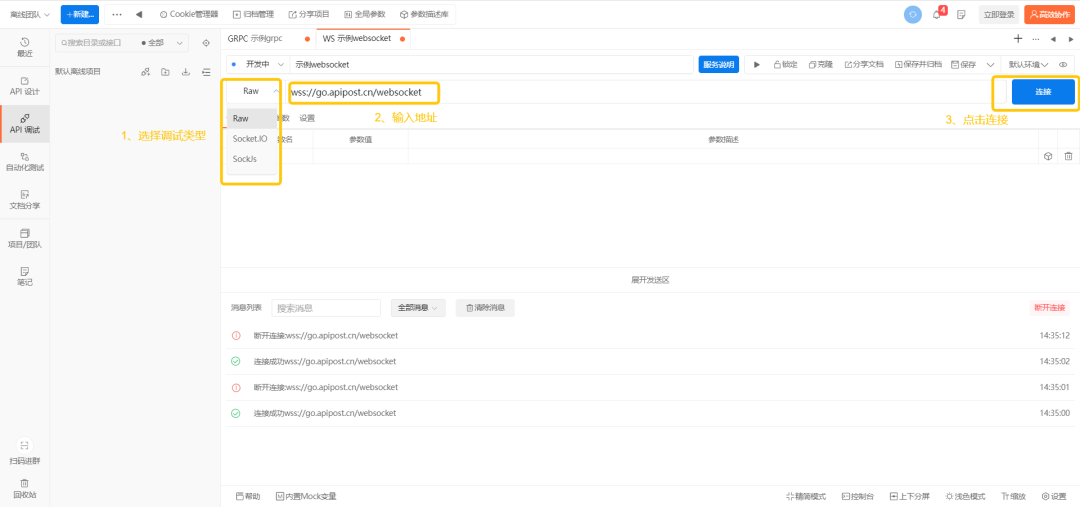 由于WebSocket是一种在单个 TCP 连接上进行 全双工 通信的协议,浏览器和服务器只需要完成一次握手就直接可以创建持久性的连接,并进行双向数据传输,所以WebSocket的应用场景也越来越广泛。Apipost 7 支持WebSocket、Socket.IO和Socket.JS类型调试 ,能满足多种场景的调试。调试步骤也so easy:
