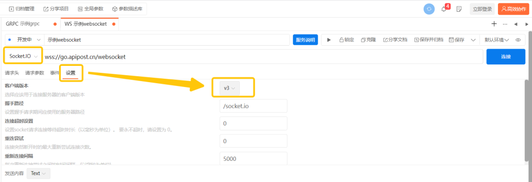 (注:Socket.IO调试在输入地址后,可以在“设置”里选择应该用于连接服务器的客户端版本)