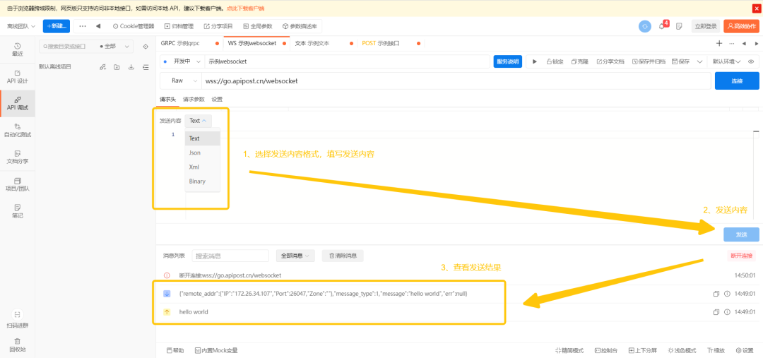 Apipost 7 支持发送Text、JSON、XML、Binary四种格式的内容 ,选好格式后输入内容,就可以发送了。