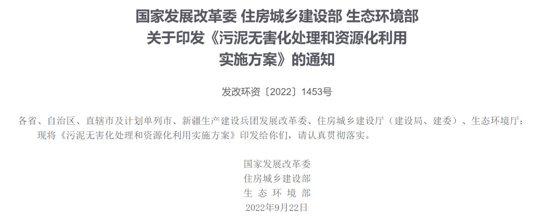 文件发布 | 国家发展改革委 住房城乡建设部 生态环境部联合印发《污泥无害化处理和资源化利用实施方案》