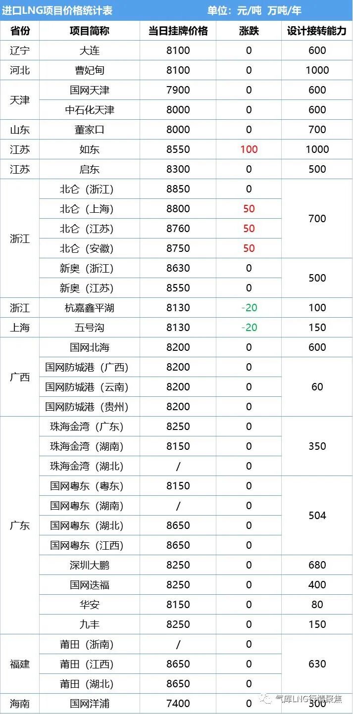 评述:今日LNG市场液价整体仍然呈现上涨走势,整体上行50-120元/吨。国产LNG方面,西北地区出货情况可观,部分液厂库存低位且区内有补库需求,支撑液价上行;山西地区受前几日补库需求影响,区内库存无压,今日部分液厂低价补涨,高价维稳,因西南四川地区昨日限行结束,区内资源可大量外流,价格优势可向华中一带输出,一定程度上冲击了其他液源在华中地区的销售。进口LNG方面,浙江北仑接收站上调50元/吨,如东接收站上调100元/吨。