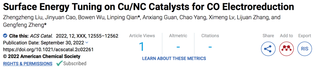 Zhengzheng Liu, et al, Surface Energy Tuning on Cu/NC Catalysts for CO Electroreduction, ACS Catal. 2022