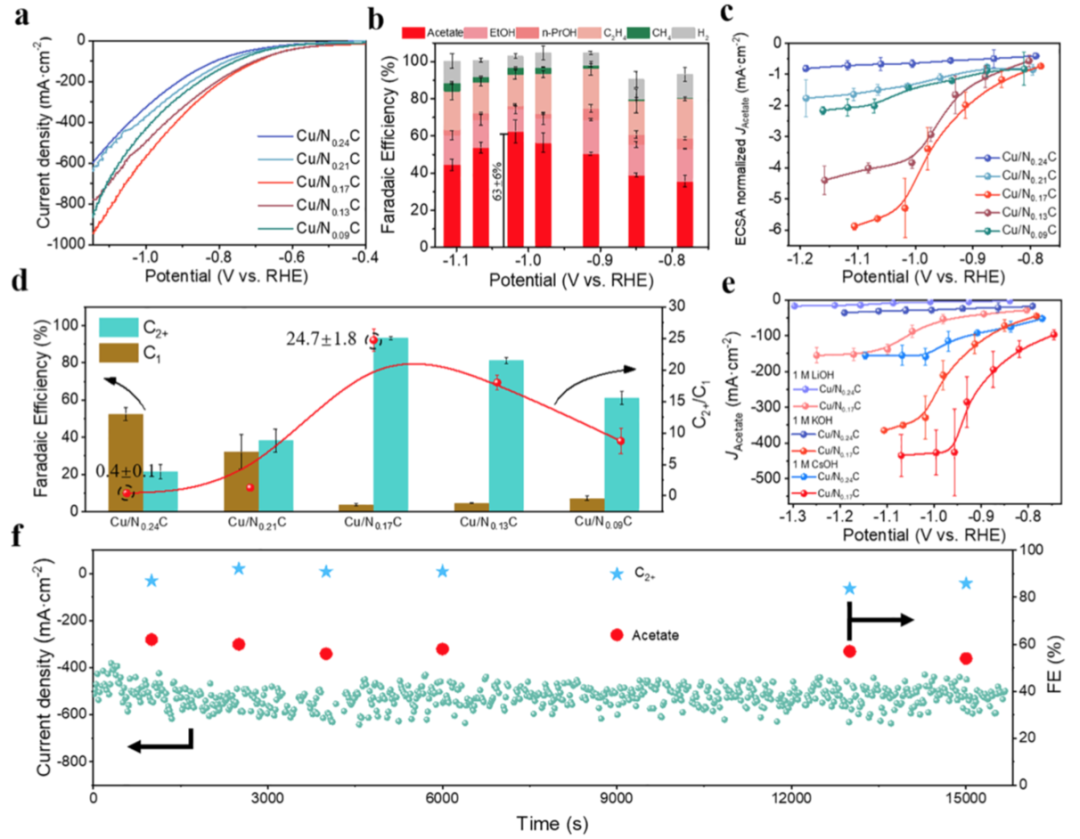 要点2. 表面能分析表明,具有最高碱性参数( K D =7.350 )和最佳酸相互作用( K A /K D ∼ 0.046 )的 Cu/N 0.17 C 催化剂具有较高的催化性能,其法拉第效率 (FE) 为 63% ,部分电流密度为 -330 mA·cm −2 。结果表明,暴露的催化剂中心有利于活化 H 2 O ,稳定含氧中间体,有利于 CO 电化学转化为乙酸酯。