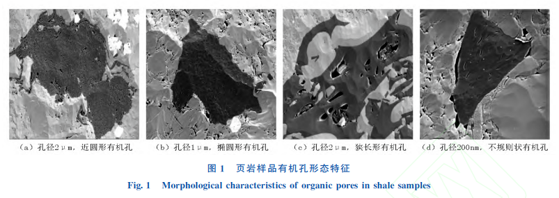 利用 Crossbeam550型扫描电镜仪器对岩样进行抽提清洗,在样品表面上用细聚焦电子束由点到行进行扫描,最终利用探测器对图像进行放大处理,通过不同放大倍数下的观察,从而对微米级、亚微米级和纳米级孔隙进行观察和分析。图像分析结果显示,研究区页岩样品的孔隙分为有机孔和无机孔两大类。有机孔是页岩有机组分在生烃过程中在有机质内部或边缘所产生的孔隙,是页岩油储层重要的孔隙类型。如图1所示,通过不同倍数观测到有机孔形态多样,多以近圆形和椭圆形为主,局部发育狭长型和不规则状有机质孔。研究区页岩热演化程度偏低,并不发育蜂窝状密集分布的有机质孔隙,多为孤立的形式分布在有机质中,孔径以纳米级和亚微米级孔隙为主,少数狭长型有机孔可达到微米级 。