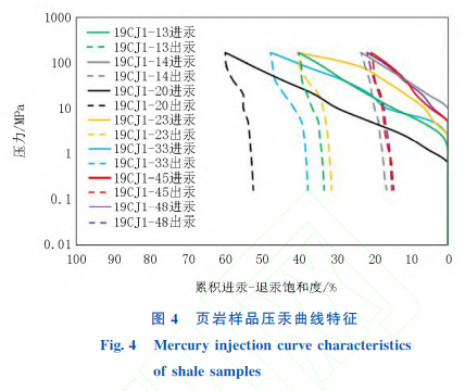 利用 PoreMaster-PM33-13型压汞仪,设置163MPa为实验最高压力,测量研究区页岩样品的进汞和退汞曲线。利用进汞、退汞曲线,结合 Washburn理论,可计算出样品的孔喉大小、孔径分布及 连通性等参数 。