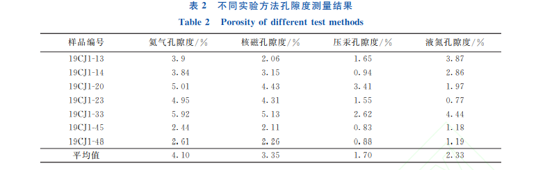 某种程度上,孔隙度的大小是孔隙结构差异的定量表现形式。为了精细描述扫描电镜、核磁共振、 高压压汞、低温氮气吸附4种实验手段评价页岩油孔隙结构的差异性,对其孔隙度测量值进行深入分析。氦气是惰性气体,常温下在岩石中不发生吸附现象,分子较小,能够进入大部分孔隙中,测量结果与真实 值最为接近。本次研究选用氦气孔隙度近似作为岩样真实孔隙度。各实验获取孔隙度结果如表2所示。