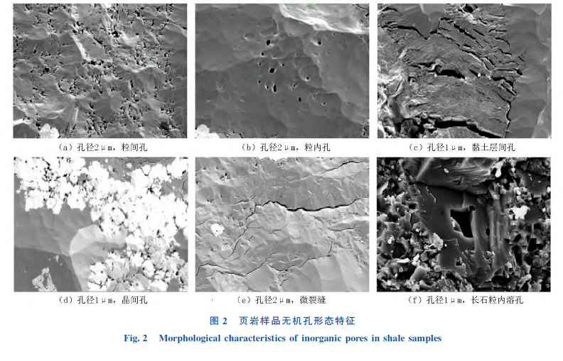 无机孔主要发育粒间孔、粒内孔、黏土层间孔。在长石、石英等矿物颗粒之间或与有机质的交接边缘处通常发育粒间孔,以近卵形、三角形或不规则状为主,多数孔径可达到数十至百纳米,普遍具有较好的孔隙连通性,是页岩储层主要的渗流通道。粒内孔发育在矿物颗粒的内部,多数以点状分布,尺寸较小。黏土层间孔是黏土矿物之间的孔隙,一般呈狭缝状,定向平行分布,长度可达5μm。由于岩石在生长过程中矿物晶体堆积疏松,造成岩样局部在黄铁矿、黏土等矿物晶体之间发育少量晶间孔。其 次,由于成岩过程中的压实、脱水收缩和重结晶作用,在无机矿物基质中发育微裂缝,具有一定的延展性,缝宽在50~580μm 范围内,局部微裂缝连接形成缝网,这种缝网在页岩油运移的过程中起到了改善渗流环境的突出作用。最后,长石与白云石均有溶蚀作用,对储层起到增孔的作用,其中长石是溶 蚀主体,白云石次之 。