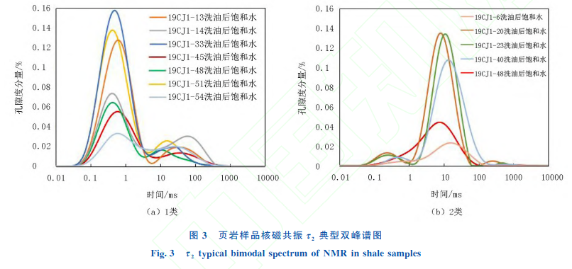 研究区页岩样品τ2 谱可以分为两种典型类型:1类和2类 (见图3)。两种类型均为双峰特征,说 明样品至少发育两种孔隙类型,τ2 谱图的左侧峰为微小孔特征峰,右侧峰为中大孔特征峰。1类样品谱 峰的位置在0.1~5ms之间,谱峰靠左,说明该类样品微小孔发育较好,中大孔少量发育;2类样品谱 峰的位置在1~100ms之间,说明微小孔隙不发育,黏土及毛细管束缚水含量少,该样品以发育中大孔 为主。结合全岩矿物、扫描电镜及地化实验分析,1类样品τ2 谱整体黏土及有机质含量较高,发育多 种孔隙类型,孔隙结构复杂,有机孔占其样品孔隙类型的主导位置;2类样品τ2 谱则以无机孔为主, 主要发育剩余粒间孔及溶蚀孔,中大孔隙发育,整体物性优于1类样品,但生油能力较弱。