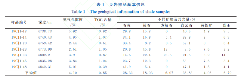 为了增加不同测试结果的对比性,将同一深度点上的页岩样品切分成平行样,分别开展矿物成分、 地化特征和气测孔隙度测试,结果如表1所示。由表1可知,页岩样品总有机碳 (TOC)含量分布范 围为0.39%~1.07%,氦气孔隙度分布范围为2.61%~5.92%。矿物成分以石英与白云石为主,长石 含量次之,部分样品发育填充堵塞孔隙的方解石,黏土平均含量为6.79%,其他矿物成分含量较少。石英对储层孔隙有一定的支撑作用,长石和白云石易发生溶蚀形成次生孔隙,三者整体含量高的样本, 其孔隙发育情况要优于其他样品 。