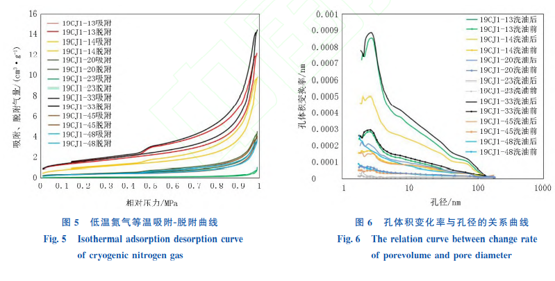 首先选取洗油前后的残余样品,粉碎为60~70目,碎样分别在 60、100℃下抽 真空至压力为30mmHg,再分别通过100、300℃环境下烘干24h,将样品中过剩水分和杂质气体进行去除,通过低温氮吸附设备ASAP2420在临界温度下测量氮气的吸附量和脱附量,最终得到洗油前后的低温氮气吸附、 脱附曲线及样品孔径分布等实验数据。