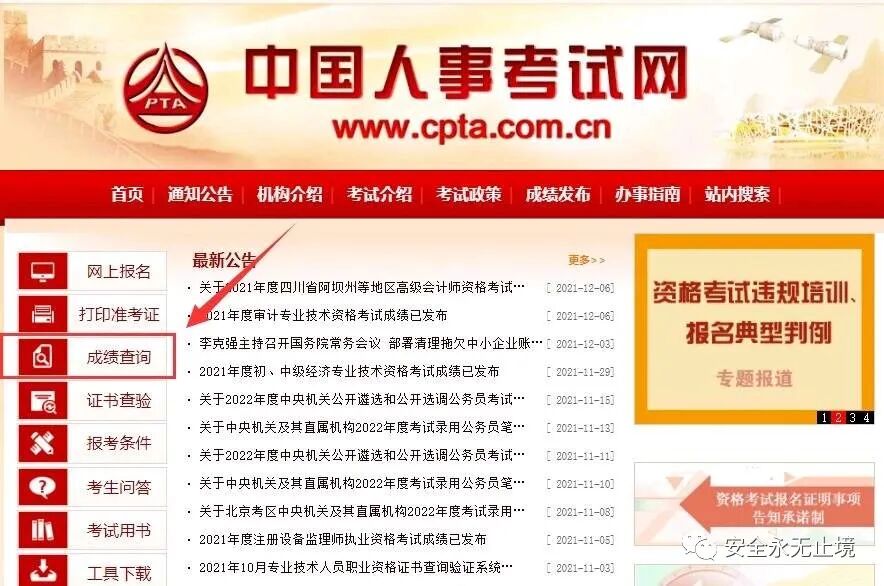 ( http://www.cpta.com.cn/index.html ) 点击左侧导航 【成绩查询】 栏目;