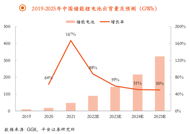 中国储能电池出货量保持高速增长势态, 未来3年年均增长率超过50% 。2021年中国储能电池出货量达到48GWh,同比增长167%,预计2022年装机量超过90GWh,同比增长88%,2025年将超过324GWh。