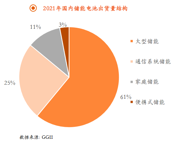 国内储能电池主要应用于大型储能(电力系统储能)、通信系统储能、家庭储能和便携式储能。 大型储能 是储能电池的主要应用场景,主要用于发电侧、电网侧及用户侧的储能集装系统,出货量占比达到61%,其次是通信系统储能,主要用于通信基站备电,占比达到25%, 家庭储能产品主要出口国外 。便携式储能占比最少,仅3%。