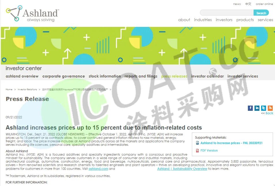 近日,全球领先的特种化学品公司 Ashland(亚什兰) 宣布,自10月1日起,将在合同允许的情况下 把产品价格提高15%, 以缓解与原材料,能源,货运和劳动力相关的持续普遍通胀带来的成本压力。