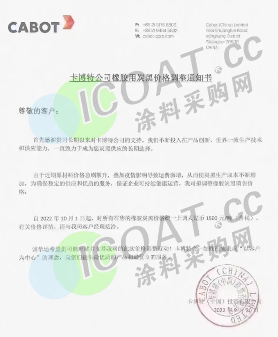 卡博特: 10月1日起,对所有在售的橡胶炭黑价格 统一上调人民币1500元/吨(含税)。