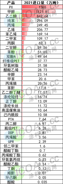 据公开数据,在130多种关键基础化工材料中, 我国32%的品种仍为空白,52%的品种仍依赖进口。 我国2021年化工品进口量超过4000万吨,其中氯化钾进口依赖度高达57.5%,MMA对外依存度超60%,PX、甲醇等化工原料2021年进口量超过1000万吨。