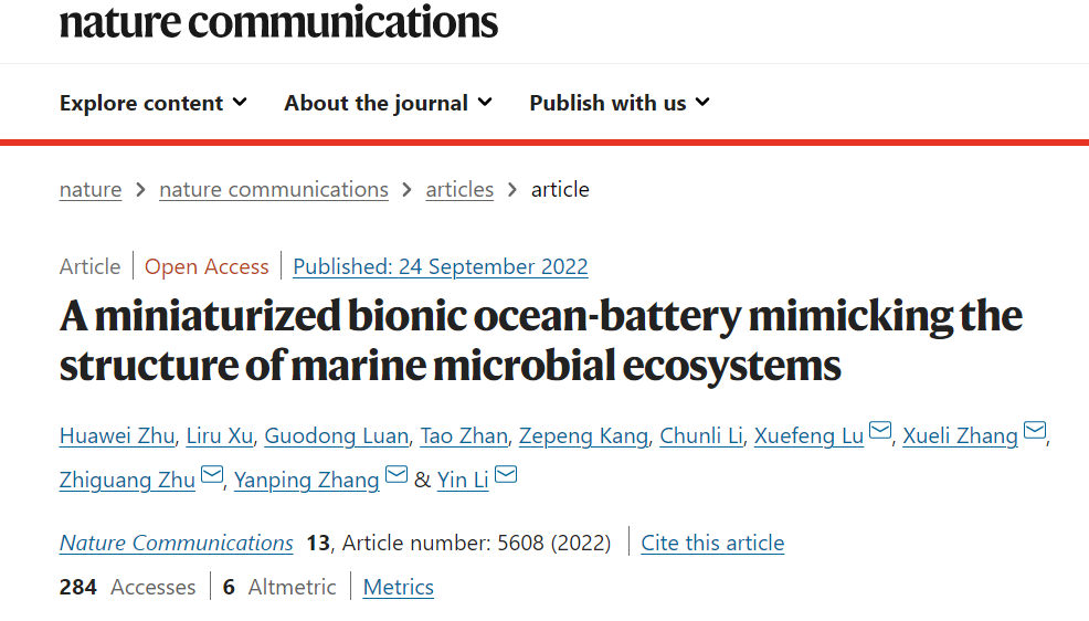 Zhu, H., Xu, L., Luan, G. et al. A miniaturized bionic ocean-battery mimicking the structure of marine microbial ecosystems. Nat Commun 13, 5608 (2022).