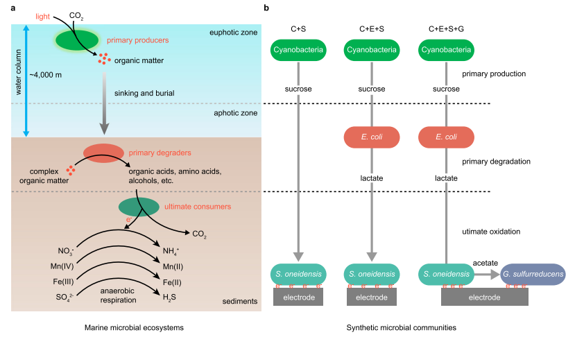 近日, 中国科学院微生物研究所Yin Li,中科院青岛能源所Xue feng Lu,Yanping Zhang,中国科学院天津工业生物技术研究所Zhiguang Zhu,Xueli Zhang 通过模拟海洋微生物生态系统的生态结构,构建了一个由四种微生物群落组成的生物太阳能电池。