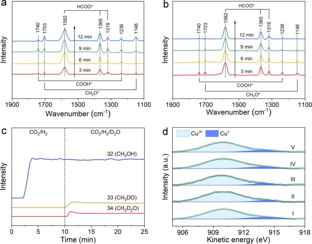为了研究水对于反应机制的内在影响,他们进行了原位红外光谱的测试,发现 COOH* 为活性中间体 ; 而 HCOO* 为 反应的惰性“ 旁观者 ”,难以进行下一步转化。 水会加速 COOH* 和 CH 2 O* 的转化(图 3a 和 3b )。为了探索水的瞬态影响 机制 ,他们开展了同位素实验,使用 CO 2 /H 2 /D 2 O 作为反应物,并通过质谱发现 D 2 O 通过提供 D 原子直接参与了 CO 2 加氢反应(图 3c )。为了揭示 Cu1/ZnO 的失活和再生机制,他们对反应后的催化剂进行了结构表征,将催化剂失活归因于潮湿气氛下 Cu 的氧化,而再生过程则是将氧化的 Cu 物种进行还原,使得催化剂恢复活性(图 3d )。