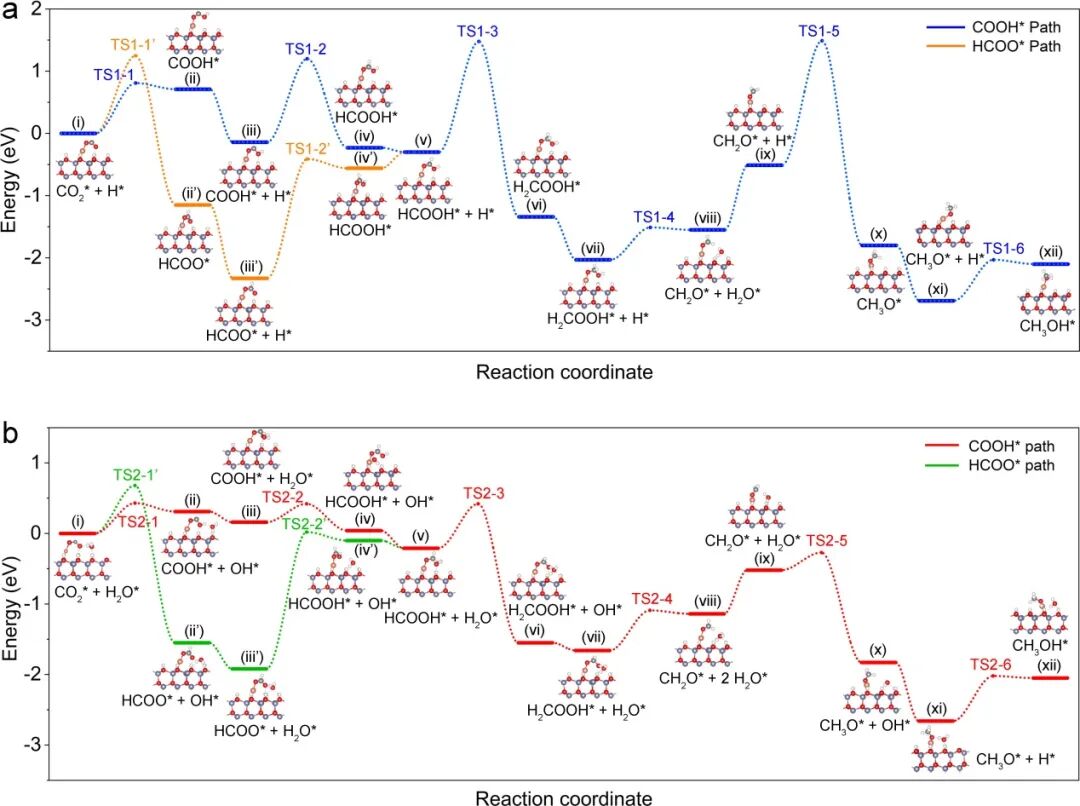 通过密度泛函理论( DFT )对实验观察到的现象进行分析,他们发现水促进了 Cu1/ZnO 上 CO 2 加氢的反应动力学过程,水充当 H 原子与 CO 2 及反应中间体之间的桥梁。水参与 CO 2 加氢生成甲醇的表观能垒,远低于没有水时的表观能垒,水的参与加速了相对稳定的中间体 COOH* 和 CH 2 O* 的转化,从而提高了反应活性 (图 4 ) 。
