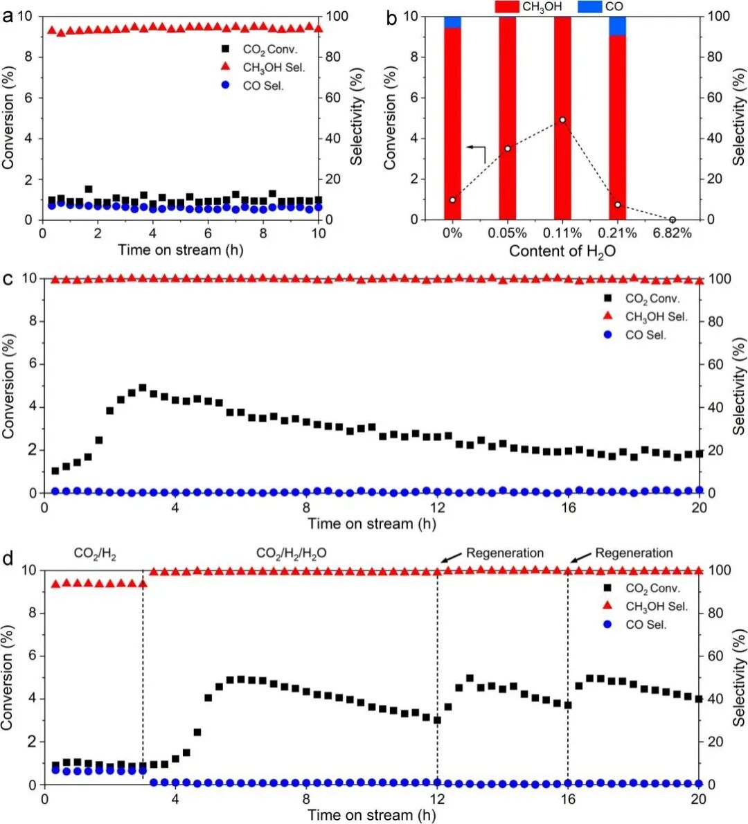 Cu1/ZnO 的催化测试在高压固定床中进行,随着水含量的增加可以很明显的 看出 CO 2 转化率和甲醇选择性都呈现出火山型趋势,并在水含量为 0.11 vol.% 时达到最大值(图 2a 和 2b )。在引入具有最佳水含量( 0.11vol.% )的 CO 2 /H 2 /H 2 O 混合气后,甲醇的选择性立即变为 99.1% ;同时, CO 2 转化率开始逐渐增加,在反应开始 3 h 后达到最大值为 4.9% ,在反应 20 h 后, CO 2 转化率又下降至 1.8% (图 2 c )。这些结果表明适量的水不仅有利于提高甲醇的选择性,而且能提升 CO 2 加氢的瞬时活性。为了在最佳水含量下保持高转化率,他们在催化剂完全失活之前对其进行了再生活化。图 2 d 显示了一个完整的演化过程,再生后 CO 2 转化率仍然呈火山型趋势,最大值为 4.9% ,在反应 16 h 时转化率下降为 3% ,再对催化剂进行再生,也表现出一样的结果,整个催化过程中甲醇的选择性都大于 99% ,这表明了再生的有效性。 通过扩展实验,发现这种现象也适用于商用甲醇合成催化剂。