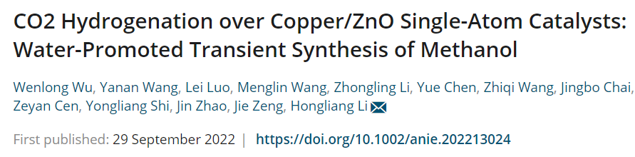 论文信息 CO 2 Hydrogenation over Copper/ZnO Single-Atom Catalysts: Water-Promoted Transient Synthesis of Methanol ( 10.1002/anie.202213024 )