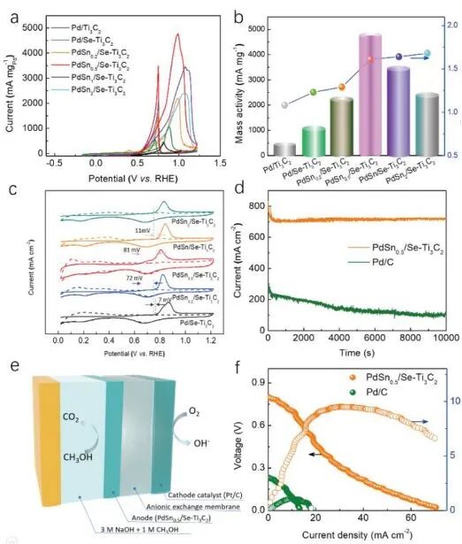 性能测试结果显示,Pd/Se-Ti 3 C 2 催化剂(1046.2 mA mg -1 )的MOR质量活性是Pd/Ti 3 C 2 的2倍以上,说明在MXene上引入Se原子可以增强电子转移,加速反应动力学。此外,通过Sn位点的配位,PdSn 0.5 /Se-Ti 3 C 2 催化剂(4762.8 mA mg -1 )显示出优异的MOR质量活性,是Pd/Se-Ti 3 C 2 的4.5倍,优于许多其他报道的Pd基电催化剂。更重要的是,装配有PdSn 0.5 /Se-Ti 3 C 2 电极的DMFC显示出较大的功率密度(10.2 mW cm -2 ),远远高于商用的Pd/C。