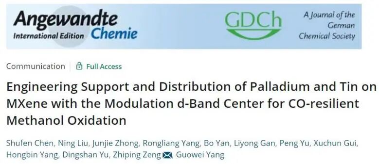 Engineering Support and Distribution of Palladium and Tin on MXene with the Modulation d-Band Center for CO-resilient Methanol Oxidation. Angewandte Chemie International Edition, 2022. DOI: 10.1002/anie.202209693