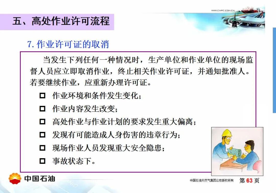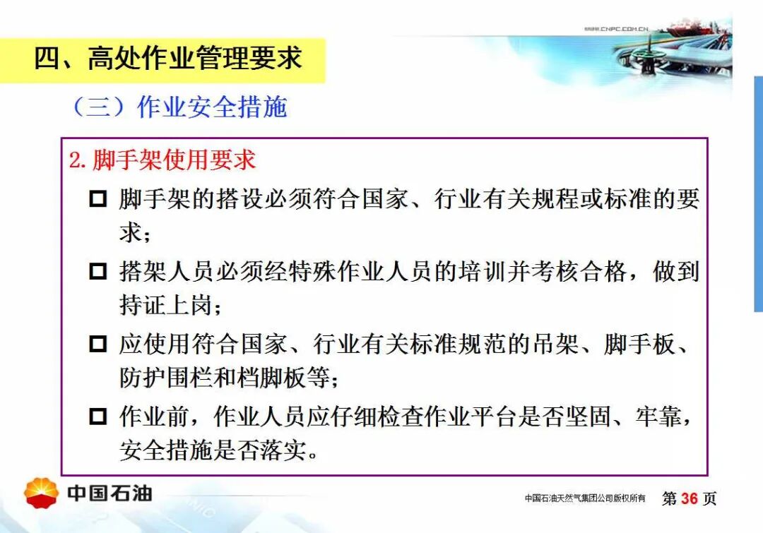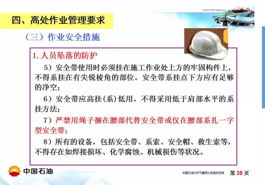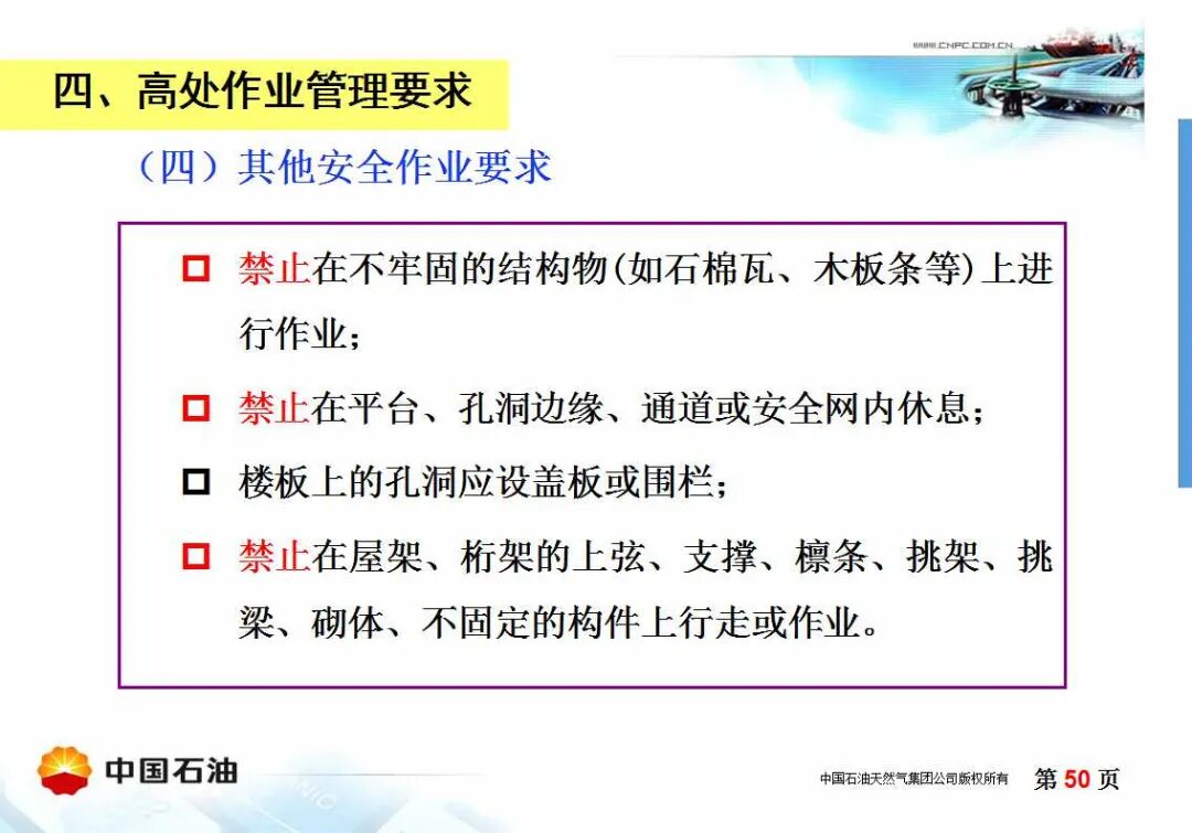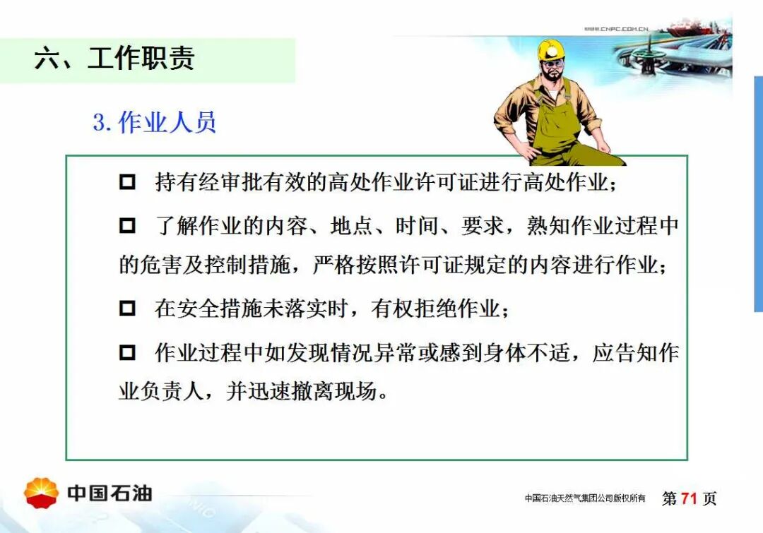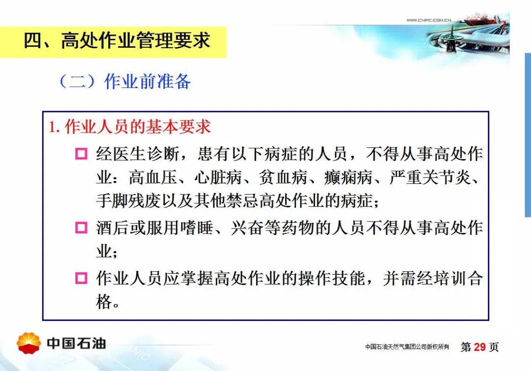 4、从事高处作业的人员必须定期进行身体检查,诊断患有心脏病、贫血、高血压、癫痫病、恐高症及其他不适宜高处作业的疾病时,不得从事高处作业。