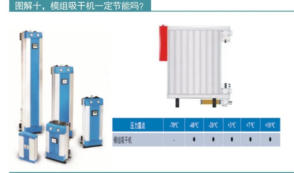 市场上,模组吸干机主要以无热和微热再生的形式出现,所以再生耗气量不会低于双塔吸干机。就像汽车在马路上跑一样,装大轮胎还是轮胎,双塔吸干机像大轮胎,工作周期长,切换频率少;模组吸干机像小轮胎,工作周期短,切换频率多。在同样工作时间内,耗气耗功应该差异不大。