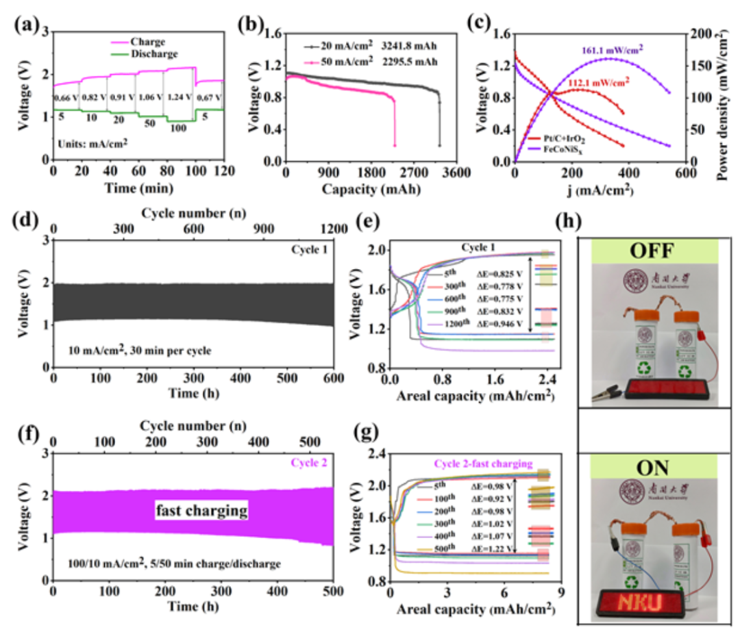 (1) 该催化剂可在10、100和500 mA/cm 2 时产生202、255和323 mV的低OER过电位,用于100 - 400 mA/cm 2 的低充电电压的快速充电锌空气电池。 此外,制备的3241.8 mAh (20 mA/cm 2 , 25°C)准固态锌空气电池在-10和25°C条件下的寿命为500 h,在40°C条件下的充电为100 mA/cm 2 条件下的寿命为150 h。
